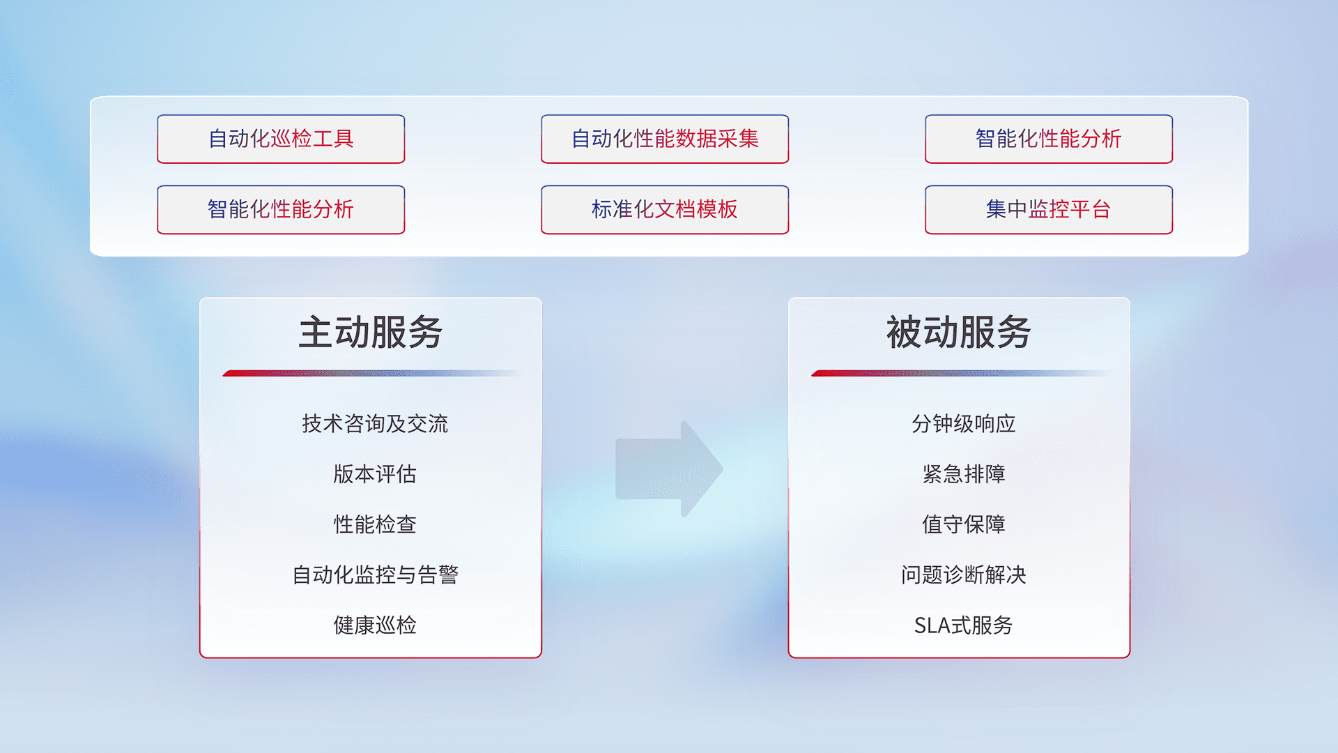 智能化工具和标准化文档,,,,保障服务质量,,提供主动服务(包含技术咨询、、、、版本评估、、性能检查、、自动化监控与告警、、、健康巡检)和被动服务包含(分钟级响应、、、、紧急排障、、、、值守保障、、、、问题诊断解决、、、、SLA服务)。。